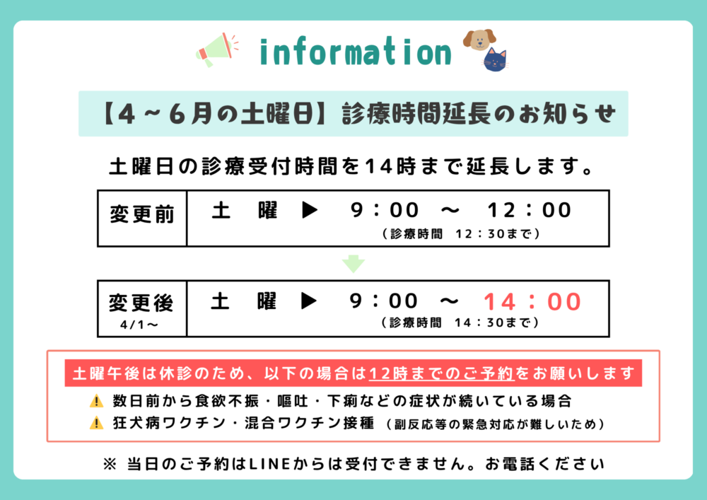 春は予防等で混雑しやすいため、下記の通り期間限定で土曜日の診療時間を延長いたします。